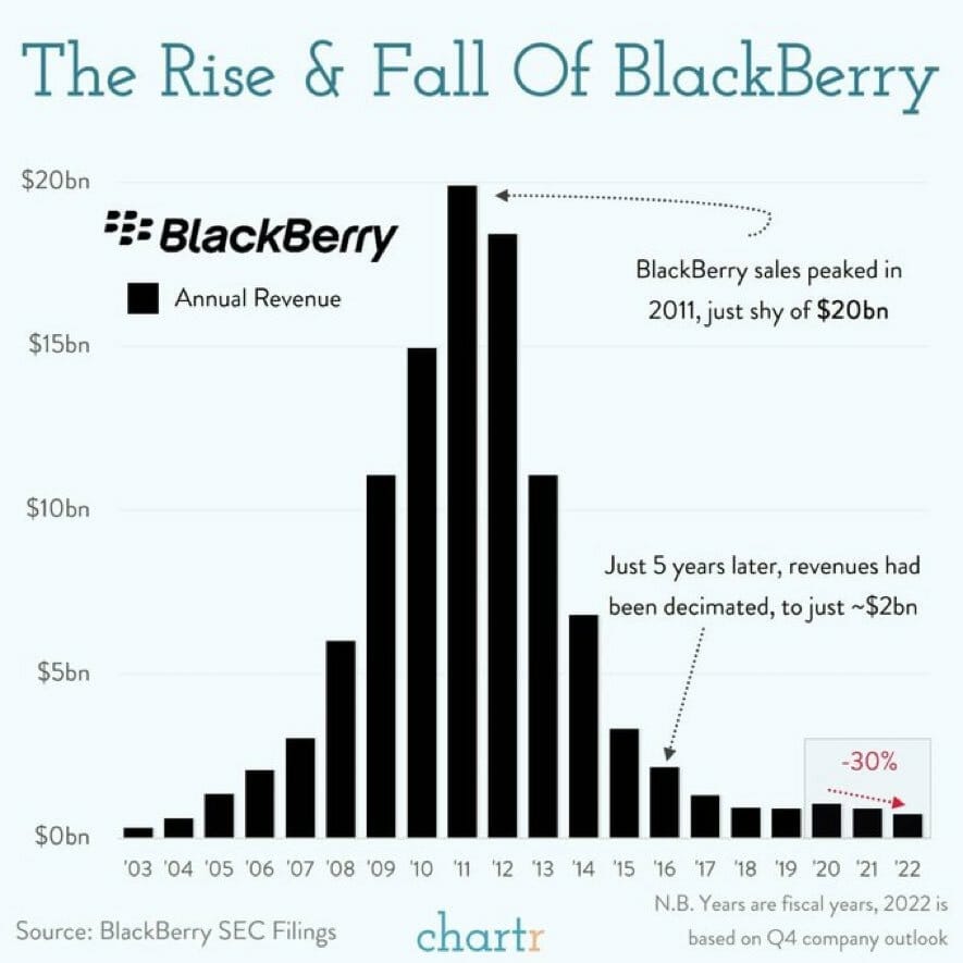 BlackBerry has now become the seminal cautionary tale of ignoring all the warning signs and digging your feet in when the writing’s already on the wall. There is no shortage of anecdotal evidence to this fact that you can easily dig up - but suffice to say - even well established moats and best practices dissipate ALL THE TIME.